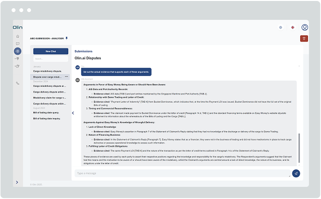 Olin.ai provides an intelligent look-through into large evidence packs to help formulate arguments, analyse underlying claims, prepare for witness cross-examinations, and automate manual tasks, such as producing summaries, generating timelines and disclosure requests.