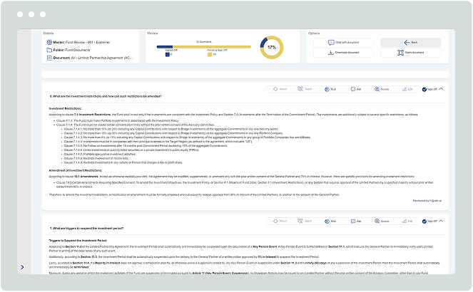 Olin.ai has been expertly trained to provide tier 1 global law firm quality reviews, summaries, and comparisons of key transaction documents such as LPAs, SHAs, SPAs, JVAs, Merger Agreements, and Loan Agreements.